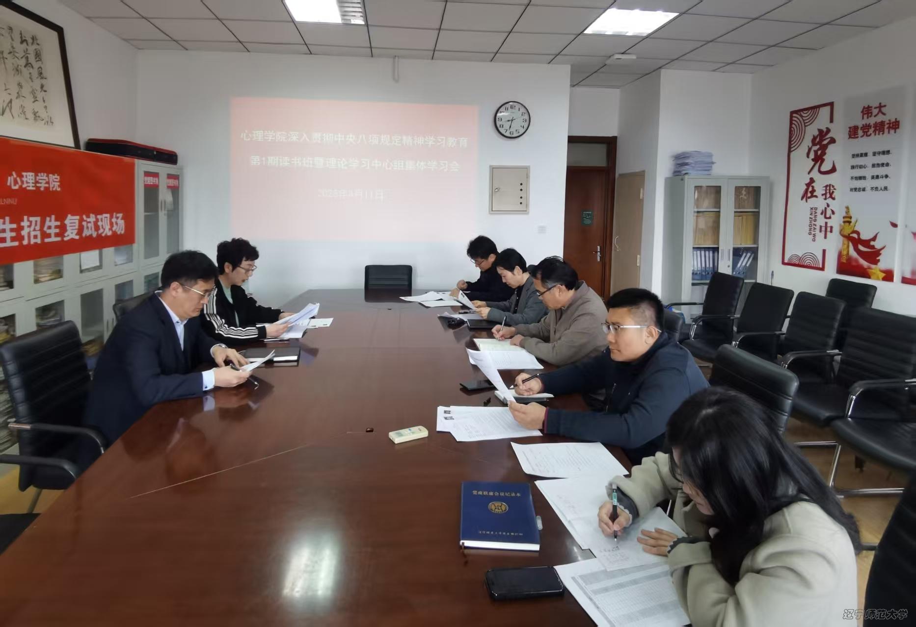 4月11日,心理学院召开深入贯彻中央八项规定精神学习教育第1期读书班暨党委理论学习中心组集体学习会议,深入学习贯彻习近平总书记关于加强党的作风建设的重要论述和《习近平总书记关于党的建设的重要思想概论》,学习领会习近平总书记在贵州、云南考察时关于开展深入贯彻中央八项规定精神学习教育的重要讲话精神,以及《中央八项规定实施细则》精神。心理学院党委理论学习中心组成员参加会议,党委书记李小倩主持会议并讲话。