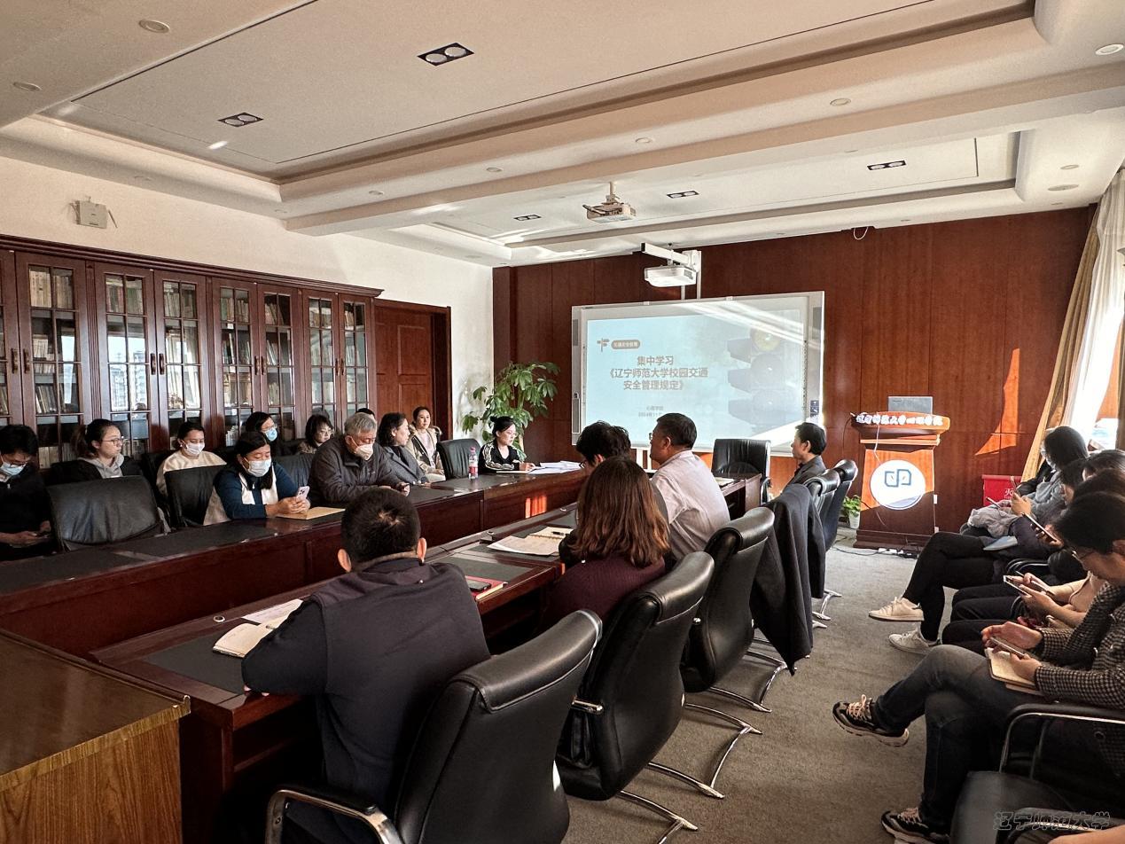 校园交通安全是保障师生生命财产安全的重要环节之一,为了提高教师遵守校园交通安全规则的意识,2024年11月21日下午,学院组织全体教师在八楼会议室集中学习了《辽宁师范大学校园交通安全管理规定》。办公室主任洪毅从道路管理、机动车与非机动车辆管理、行人管理等方面为大家解读了文件。