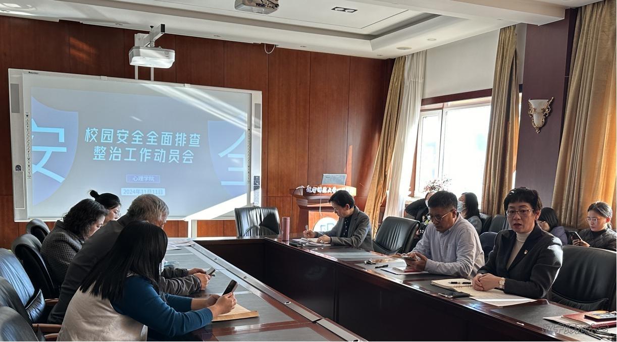 为贯彻落实学校关于辽宁师范大学校园安全全面排查整治工作的总体要求,切实消除校园安全隐患,坚决防范安全事故发生,全力维护校园安全稳定,切实保障师生生命安全,2024年11月11日下午,心理学院在八楼会议室召开校园安全全面排查整治工作动员会,全体教职工参加会议,党委书记李小倩主持会议。