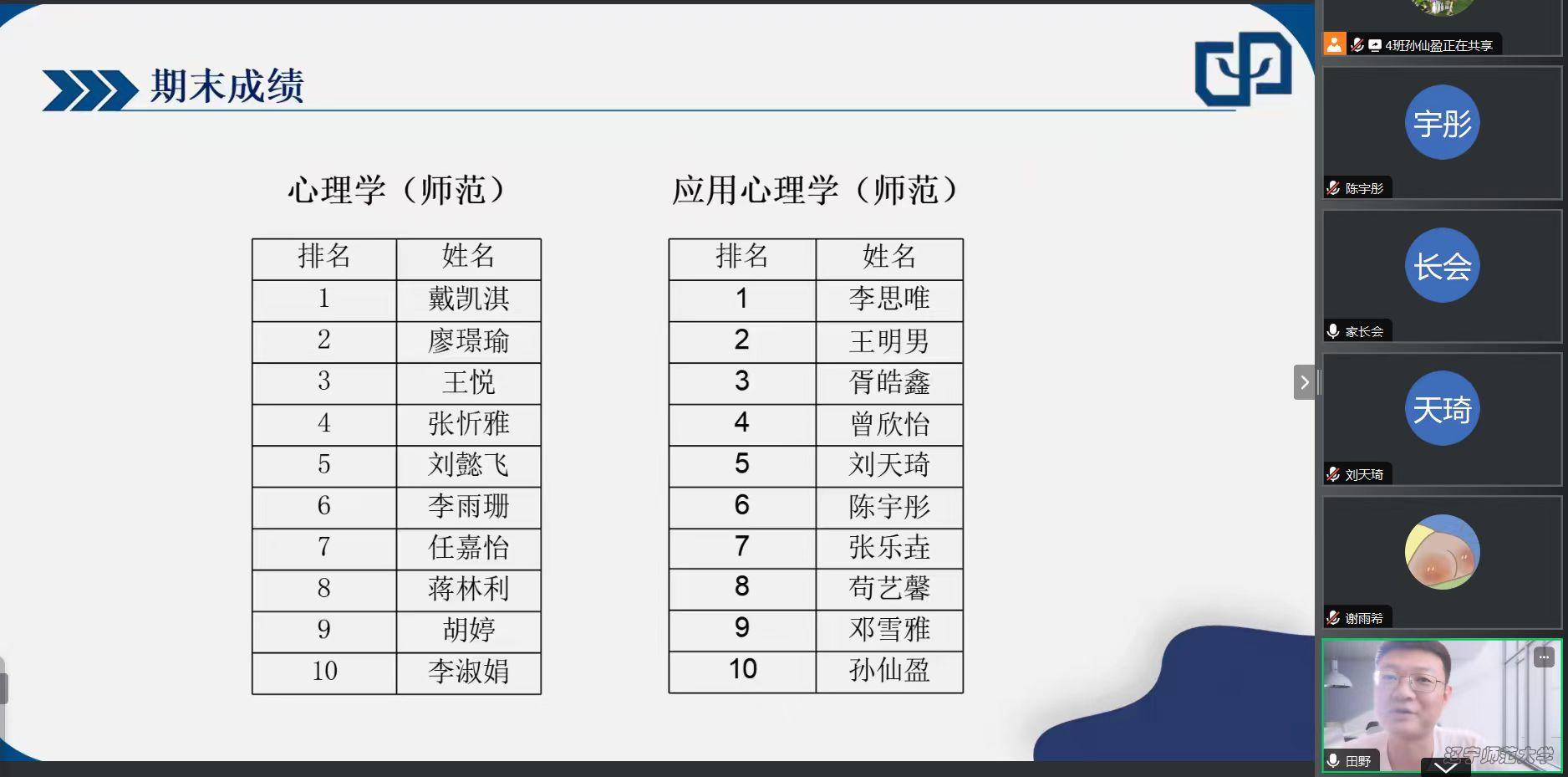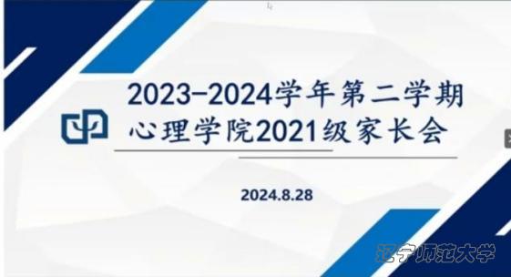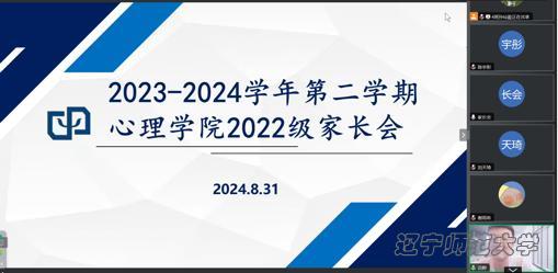 为加强家校联系,促进学生全面发展,我院于2024年8月28日、31日召开2023至2024学年第二学期本科生线上家长会。本次会议由党委副书记董成文老师和团委书记田野老师主持,心理学院全体本科生家长参加。
