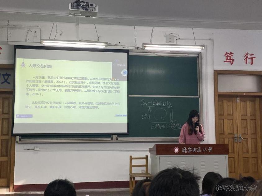 接下来是第一小组进行汇报,主题为人际交往。小组同学分享了一个人际交往出现问题的同学的案例,分析了该同学存在的心理问题以及心理机制的形成过程,还带领同学们感受了渐进式肌肉放松训练。