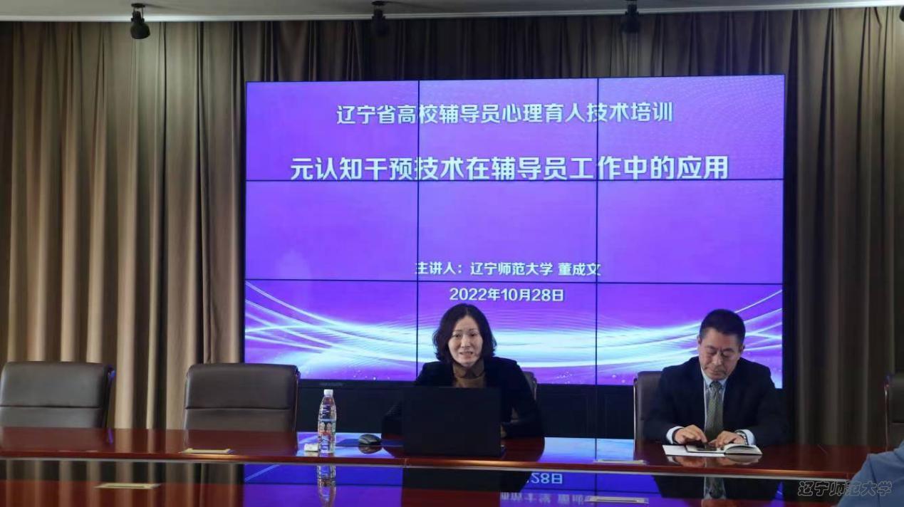 为进一步贯彻落实省教育厅《关于组织开展2022年辽宁省高校辅导员队伍职业素质能力提升计划系列活动的通知》的文件精神,全面提升我省高校辅导员心理健康教育职业能力,培育大学生理性平和、乐观向上的健康心态,促进学生健全人格的发展和全面成长成才,辽宁师范大学大学生人格教育技术化工作室受省教育厅委托,以线上直播形式面向全省高校开展辅导员心理育人技术培训。本次培训由辽宁师范大学党委学生工作部部长崔宝华主持,辽宁省辅导员名师工作室——大学生人格教育技术化工作室负责人、心理学院党总支副书记、心理学博士董成文主讲。