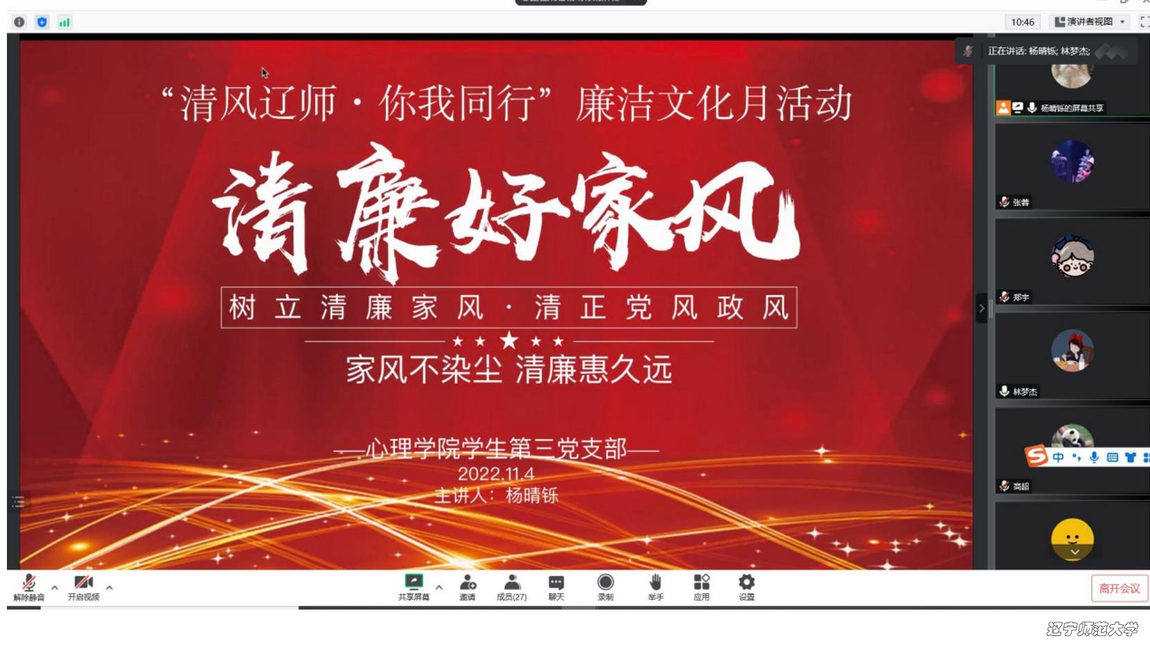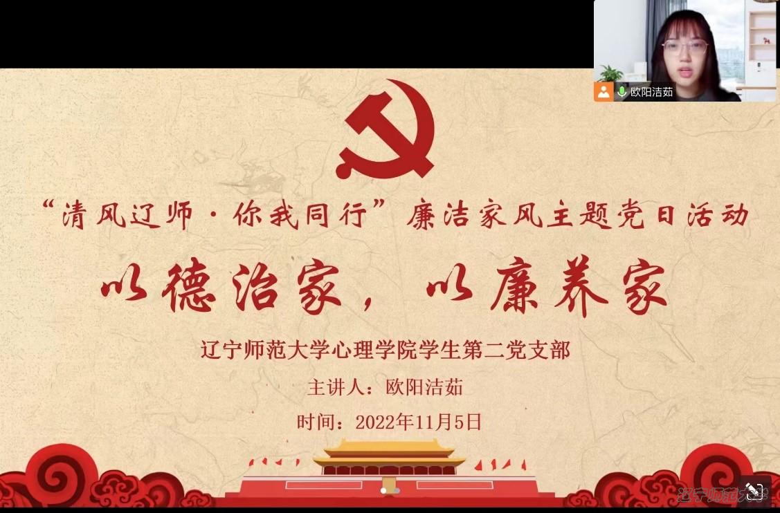 11月3日、4日、5日,心理学院学生第一党支部书记黄宝霖,学生第四党支部书记田野,学生第三党支部书记杨晴铄,学生第二党支部书记欧阳洁茹分别于线下线上在各自党支部讲授廉洁家风主题党课。黄宝霖同学从为什么要强调家风教育、如何做好家风教育两个方面讲授党课,并由钟怡雪同志诵读《于漪:教书育人传师表》故事节选。最后,全体党员以《底线》中有关“家风教育”的剧情进行研讨,强调清廉家风不仅是家庭幸福的奠基石,也是忠于职守、敬业奉献的安全阀。田野老师带领学生第四党支部党员一起重温习近平总书记就家庭家教家风建设发表的重要讲话,强调党员、干部特别是领导干部要清白做人、勤俭齐家、干净做事、廉洁从政,弘扬社会主义道德新风尚,在家庭里自觉地营造廉洁自律、忠诚担当、诚实守信的良好氛围,涵养新时代共产党人的良好家风。杨晴铄同学以修身、齐家、治国、平天下的处世哲理和爱国爱家的博大情怀为依托,带领全体支部党员明确树立清廉家风意识,进而清正党风政风。通过诵读经典家书《清风传家》节选,提出大家应该发挥党员干部立家训、树家规的带头模范作用,成为中华优秀传统文化家风的“传承者”和社会主义核心价值观的“培育者”。欧阳洁茹同学播放关于“家风”的微视频《习近平“典”亮新时代》,教育同学们“家是最小国,国是千万家”,我们每一位青年人都有责任有义务带头树立好的家风,这是历史的传承,也是时代的使命。