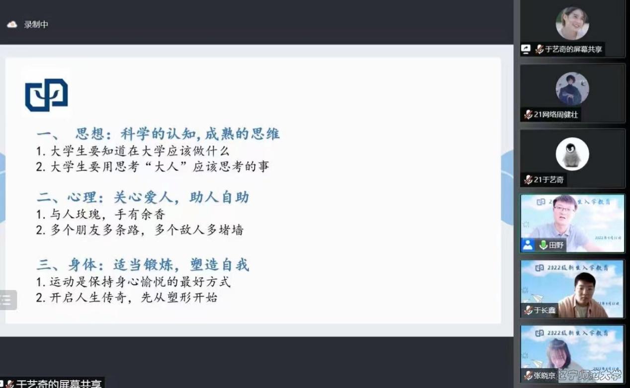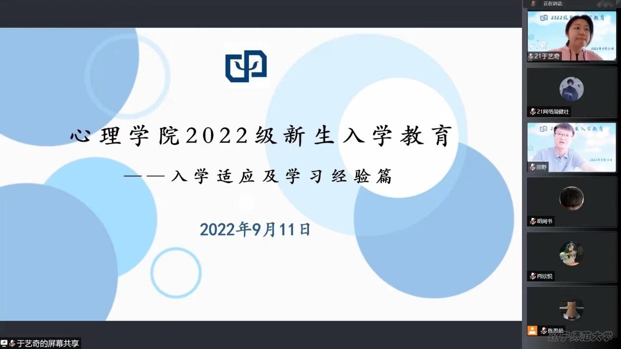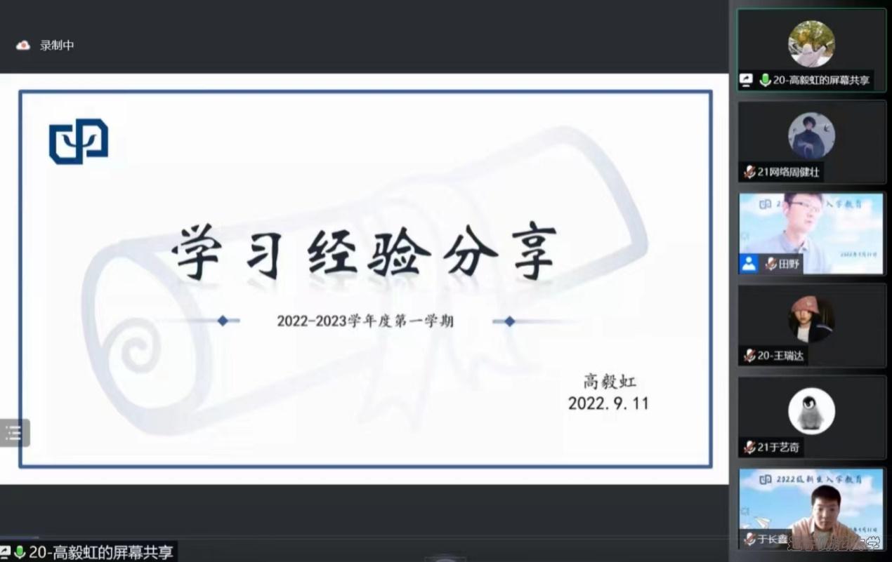 为帮助2022级新生尽快熟悉大学生活,更好地把握云端学习节奏,2022年9月11日10:00,我院于线上召开2022级新生入学教育——入学适应及学习经验篇的分享会,本次会议由学习部干事于艺奇主持,2022级本科生辅导员田野、学生会执行主席王瑞达、学习部负责人高毅虹以及2022级全体本科生出席了本次会议。