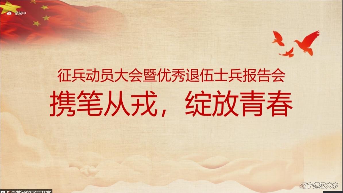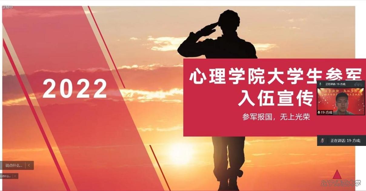 为落实国家征兵政策,鼓励广大青年学生积极参军入伍,投身军营,建设国防,2022年5月22日8:30,我院于线上召开“携笔从戎、绽放青春”征兵动员大会暨优秀退伍士兵报告会。本次大会邀请到2019级退伍大学生方成做分享,心理学院党总支副书记董成文、团委书记田野、全体本科生参加了本次报告会。本次大会由2021级本科生肖艺涵主持。