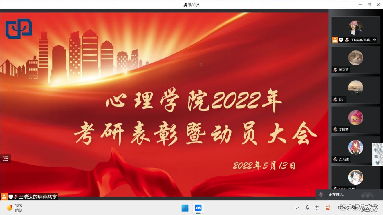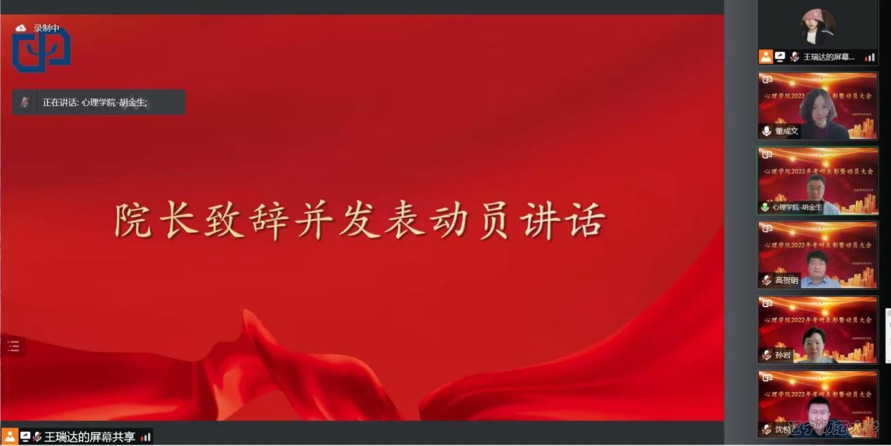 为进一步提高学生综合素质,增强学生核心竞争力,使同学们进一步了解考研形势,做好考研准备,2022年5月13日12:40,我院于腾讯会议开展线上考研表彰暨动员大会。出席本次会议的领导和老师有心理学院党总支书记李小倩、院长胡金生、副院长蒋重清、孙岩、沈悦、高贺明、系主任曲可佳、高雯、副系主任丁晓茜、张雪、团委书记田野及全体本科生,特邀嘉宾有博士生导师刘文教授和唐晓雨副教授。此次会议由党总支副书记董成文主持。