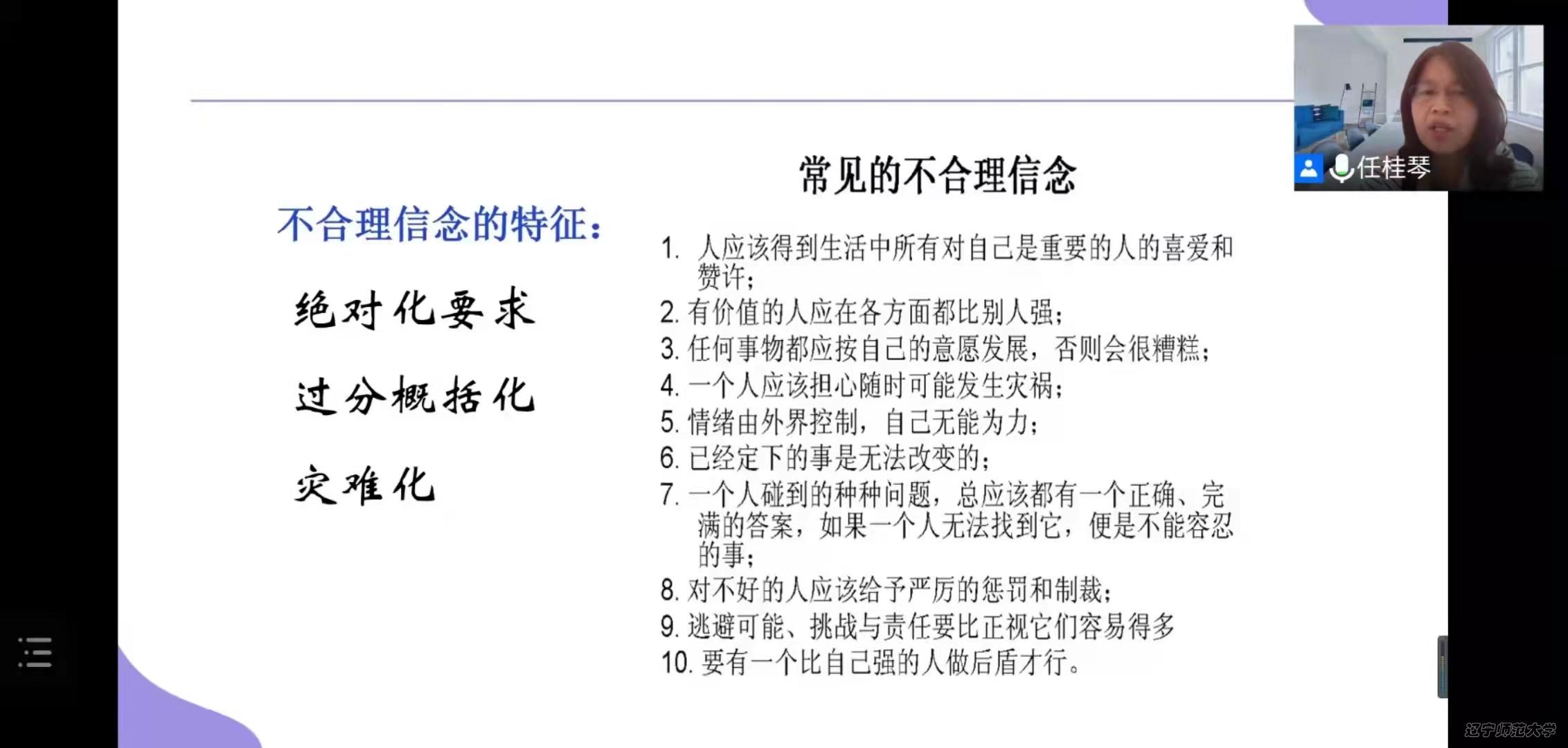 首先,任桂琴老师结合具体事例,强调了良好心态对于疫情下情绪自我调适的重要性。同时,任老师依据ABC理论分析了日常生活中的具体案例,帮助同学们了解和认识不合理信念的特征,建议同学们使用认知心理疗法转变认知。