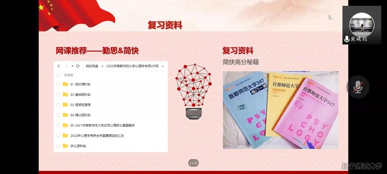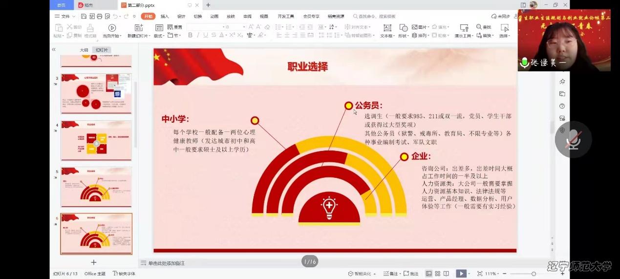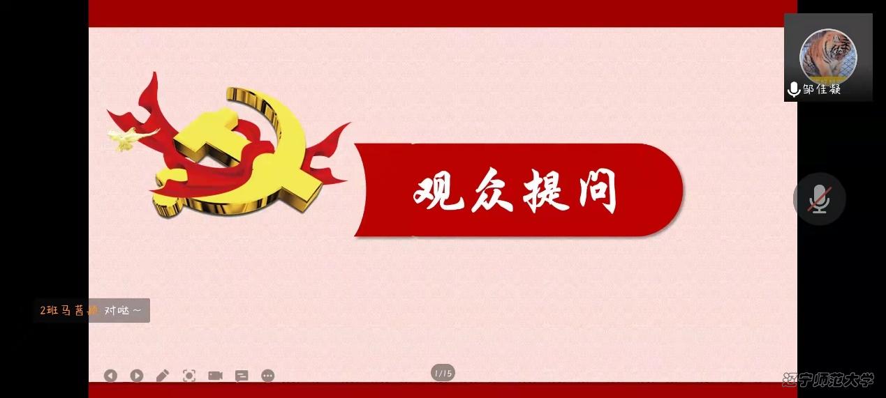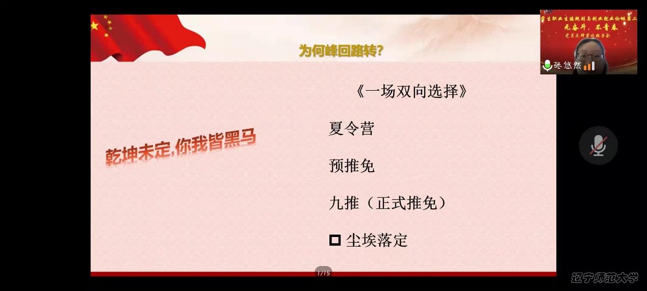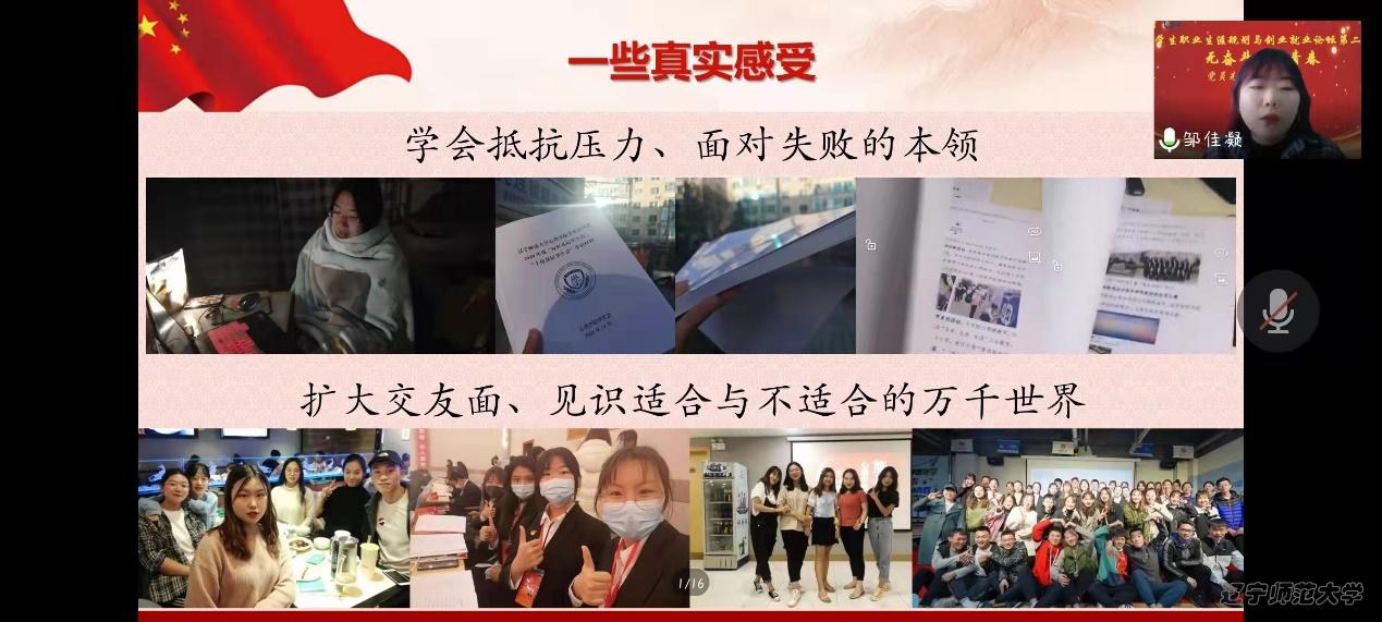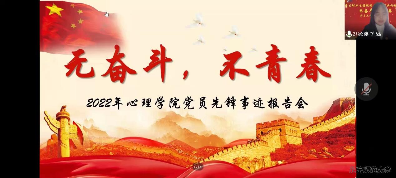 为涵养学生就业创业意识, 帮助同学们更好地进行职业生涯规划,2022年4月3日10:00,我院以“无奋斗,不青春”为主题,于线上开展了就业创业论坛系列活动之党员先锋事迹报告会。本次活动由团委组织部张艺涵主持,心理学院党总支副书记、本科生辅导员董成文、团委书记、本科生辅导员田野、党总支组织员、研究生兼职辅导员栗庆阳以及2020级、2021级本、硕学生参加了报告会。本次报告会由2022届毕业生党员邹佳凝、张逯美一、张悠然、宋晓玲报告她们在辽师成长的故事。