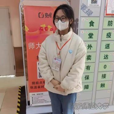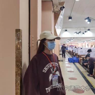 (防疫志愿者在食堂监督同学们戴口罩)