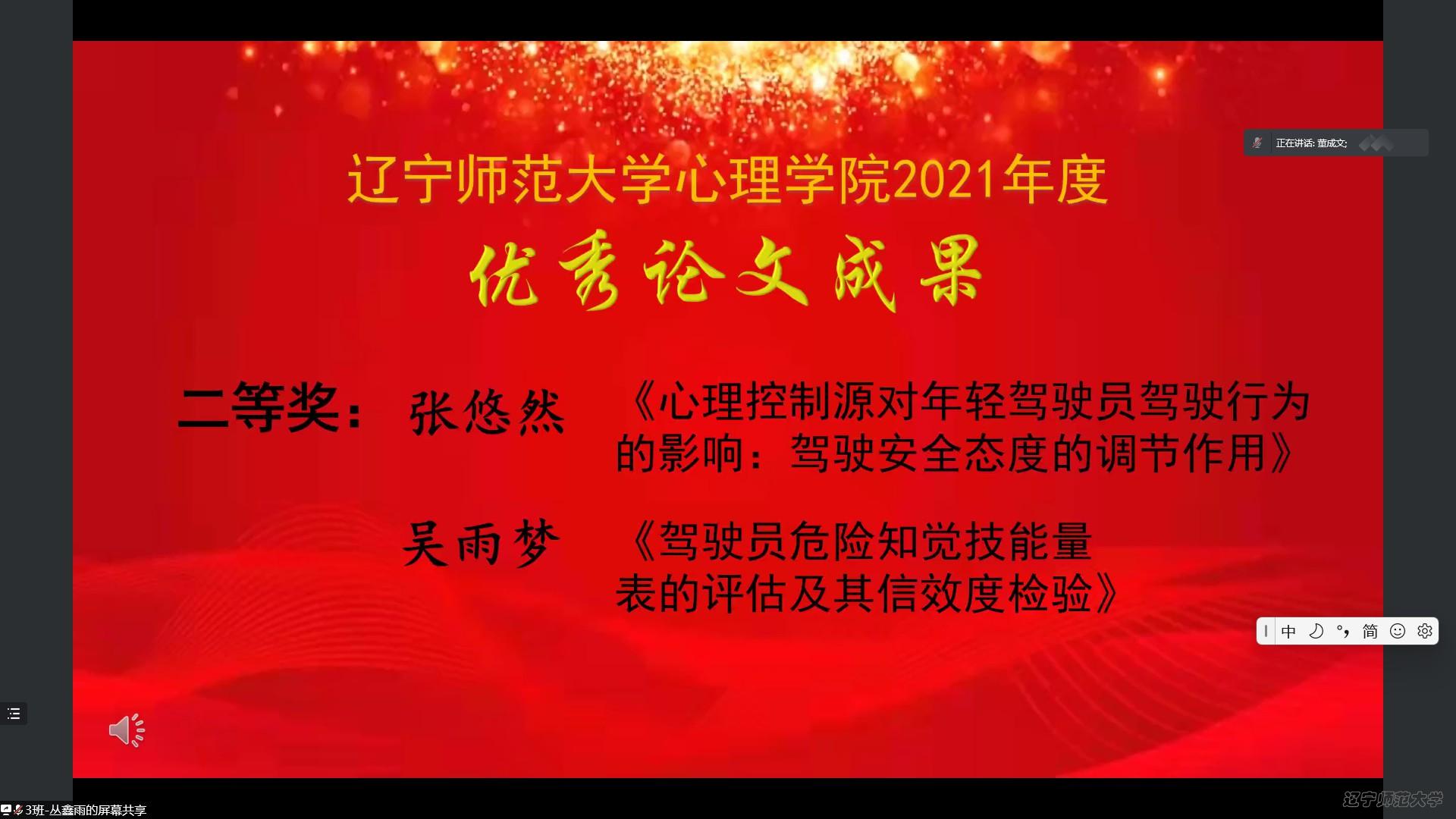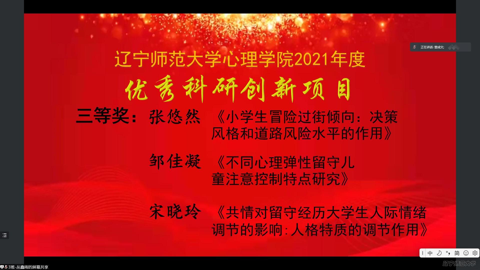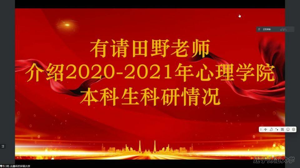 为激励我院学子积极投身科研实践,培养科研创新技能,2021年11月18日15:45,我院于线上召开本科生科研创新表彰暨经验交流会。心理学院副院长孙岩、党总支副书记董成文、团委书记田野受邀出席本次会议,参加本次大会的还有2019、2020、2021级本科生,2020级心理学(师范)专业本科生郭芮玉主持本次大会。