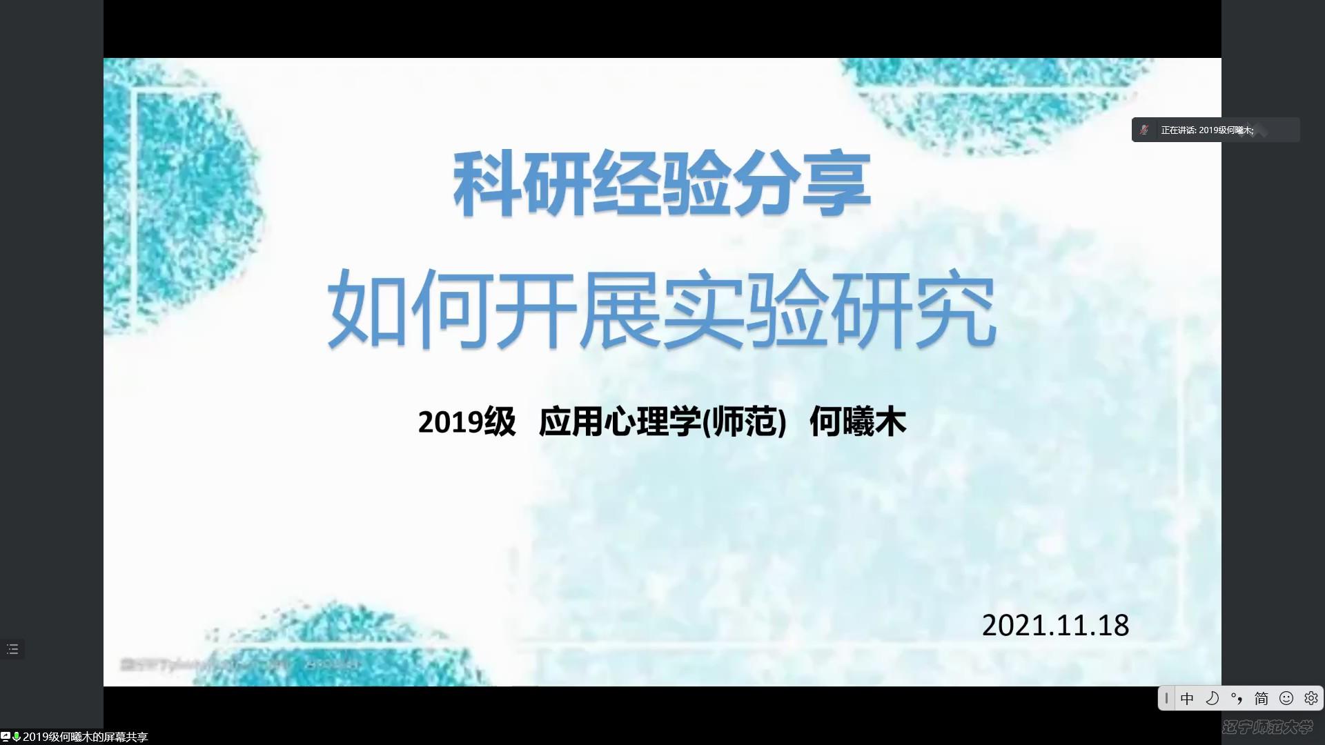 2019级应用心理学(师范)专业本科生何曦木围绕如何开展实验研究做经验分享。他从明确实验设计、重视预实验、充分考虑无关变量、不断修正这四个方面进行讲解,为同学们的科研实验提供经验,使同学们受益匪浅。
