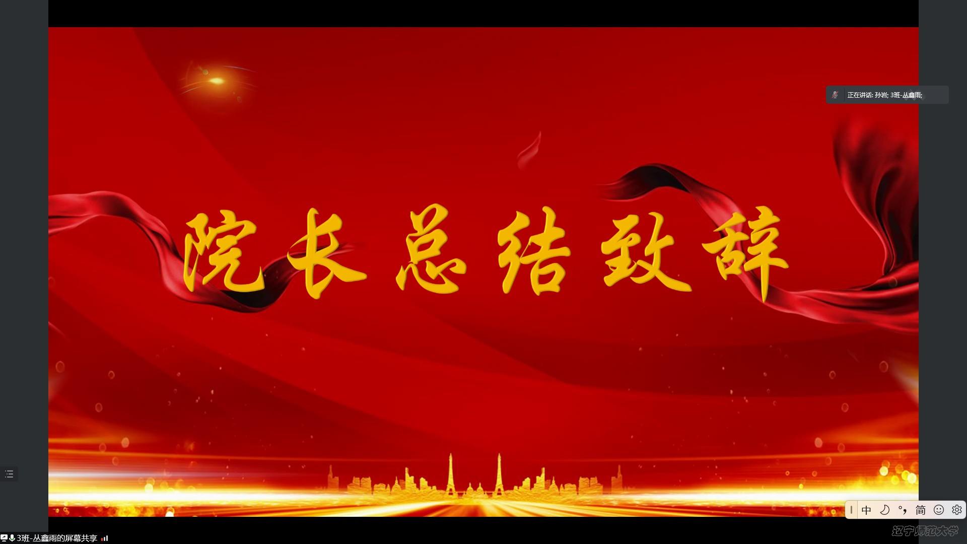 最后,孙岩副院长总结致辞。首先,她对获奖同学表示热烈祝贺,并且她希望同学们通过今天的表彰会能够有所启发,积极地去尝试、去体验科研的过程,积极地参与老师们的科研项目、报名大创项目。之后,她强调了大学生的责任感,包括家庭责任感和社会责任感,大学生应运用自身所学,报答父母并回报社会。最后,她建议学生们要重视大学的学习、科研创新,合理利用课后的时间,通过科研检验课堂上的所学,所思,遇到的问题要及时向老师、学姐和学长求助,合理安排学习和生活的时间。