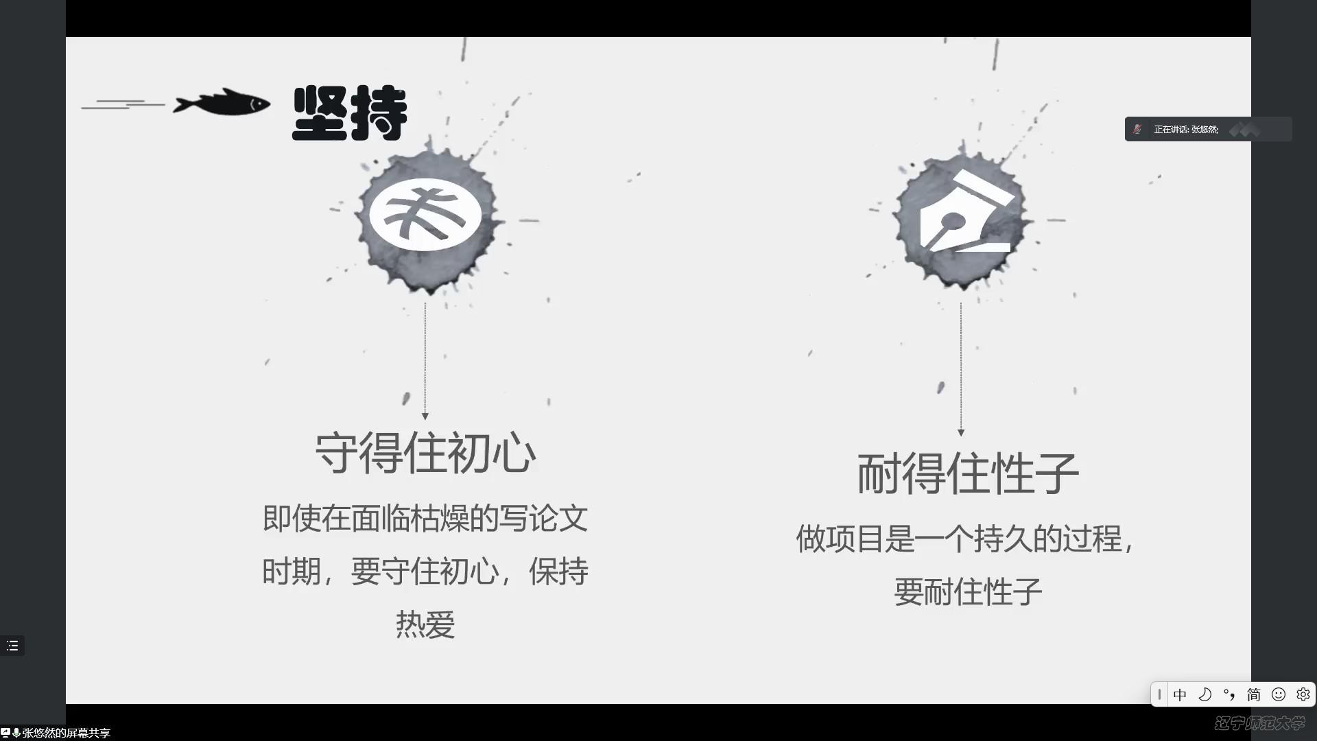 2018级心理学(师范)专业本科生张悠然以自身科研经验为依据,为同学们提出三点建议。首先是兴趣,她强调培养科研兴趣是一个从无到有的过程,需要尝试不同的方向,从而找到感兴趣的方向。其次,要保持积极主动的态度,积极思考、敢于表达自己的想法。最后,她认为最重要的就是坚持,要一直保持科研的热情,不忘初心。