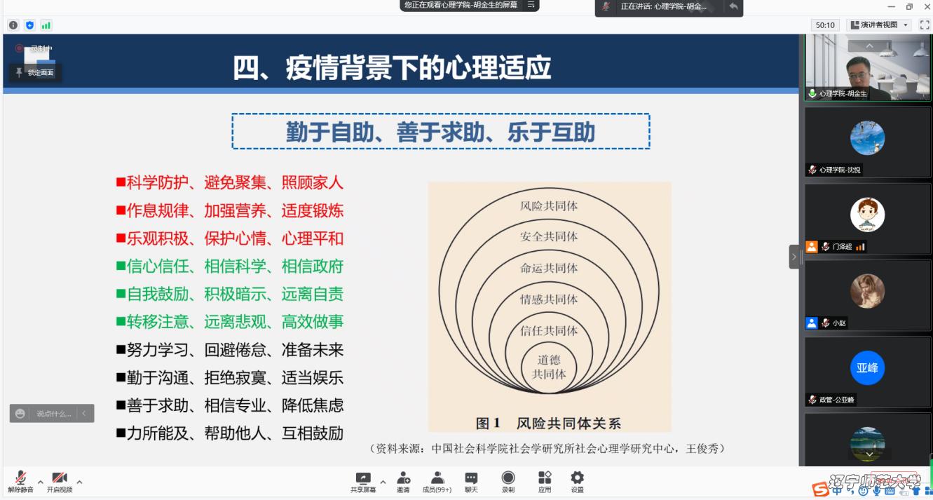 此外,为了更好地加强同学们疫情下的心理建设,疏解大家的压力和不良情绪,学院还积极组织开展了各种心理援助活动。院长胡金生、副书记董成文分别为学生做了《疫情背景下的心理适应》《疫情期间的压力管理与心理健康》专题讲座,同学们在线共同积极学习,有效缓解了自身压力与焦虑情绪。