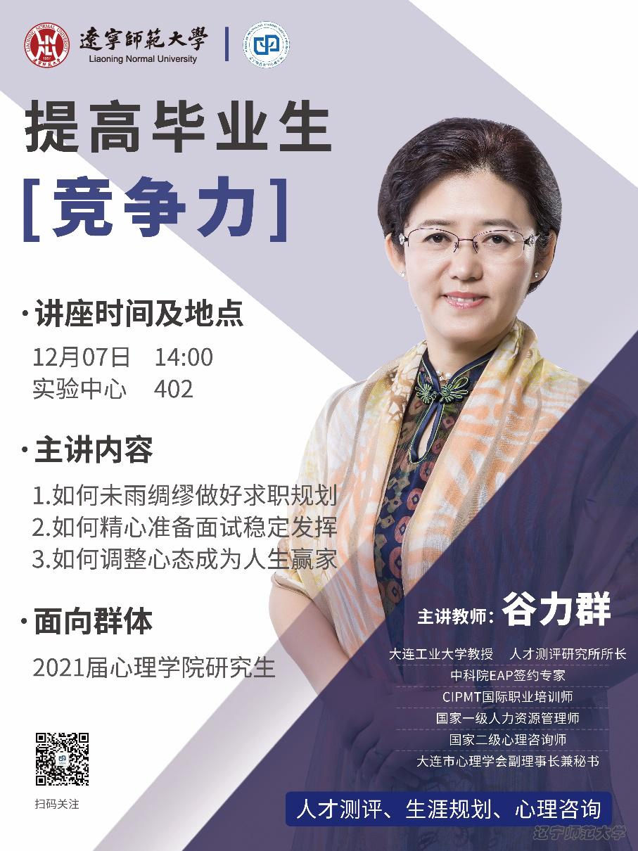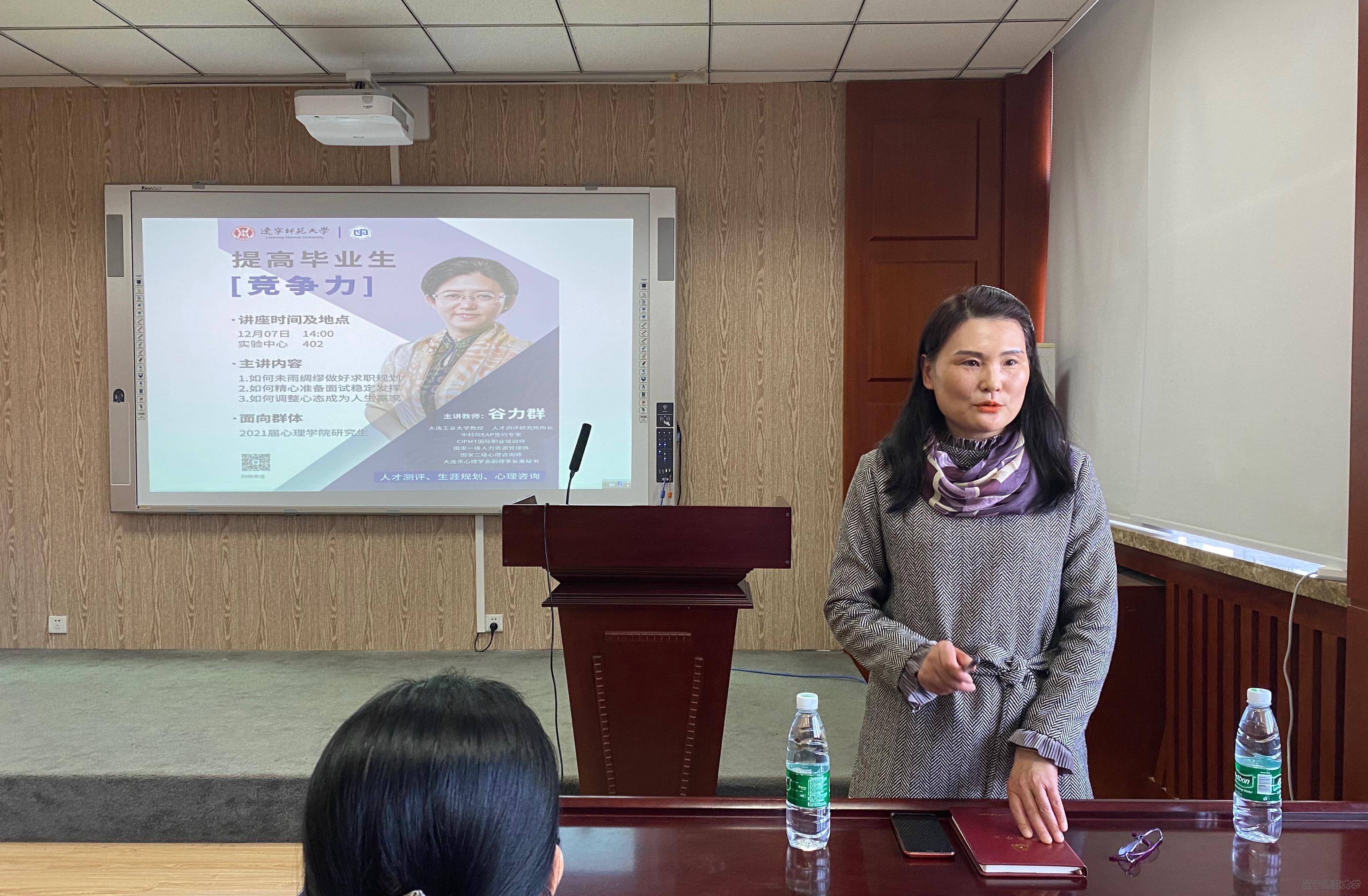 为帮助同学们更好地规划未来方向,提高毕业生竞争力。2020年12月7日下午2:00,我院于实验中心402教室举办2021届毕业生就业培训。本次培训由人才测评研究所、中科院EAP签约专家谷力群教授主讲,由研究生辅导员李毅主持,心理学院硕士毕业生参加了本次培训。