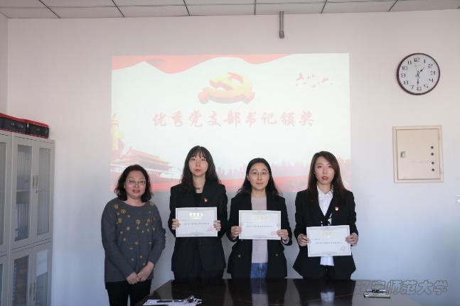 最后,经过现场投票,评选教工第二党支部为优秀党支部。评选李雨桐、霍东杰、杨泽垠、杨晴铄、张译允五位同志为优秀党支部书记,并由隋萍老师颁奖。评选崔倩同志为优秀党务工作者,并由董成文老师颁奖。评选王薪舒、黄宝霖、王馨喆、张悠然、宋晓玲、王威、林语诗、李昕八位同志为优秀党团干部,并由隋萍老师与董成文老师颁奖。