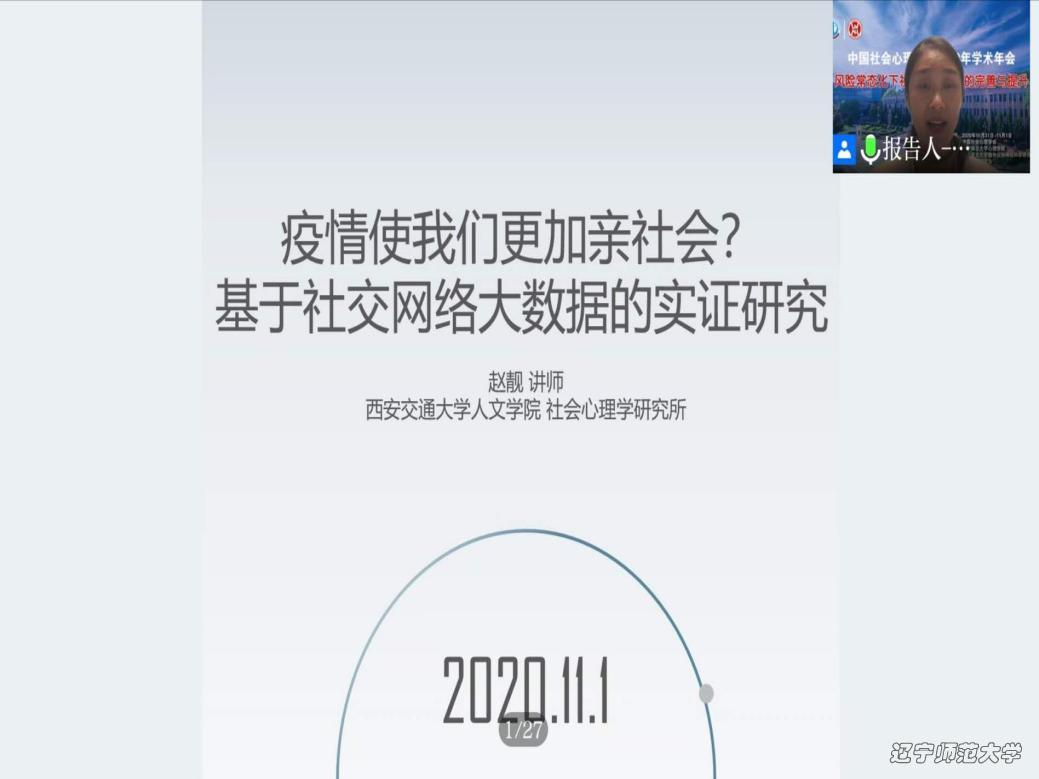 西安交通大学人文与社会科学学院学者赵靓做了题为《疫情使我们更加亲社会?基于社交网络大数据的实证研究》的报告。报告首先否定了类似新冠疫情的灾难性经历,带来的只有消极一面的言论。并提出,已有研究表明,利他和亲社会行为同样可能来源于消极生活事件或苦难经历。报告人及其团队对此进行了数据调查,基于调查结果,发现疫情确实激发了亲社会性,实证了“生于苦难的利他”理论。