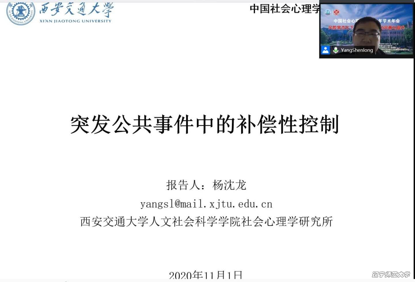 第一位报告人是西安交通大学人文社会科学学院社会心理学研究所杨沈龙副教授。他的报告题目为《突发公共事件中的补偿性控制》。该报告首先介绍了“补偿性控制”的概念,提出差异性补偿反应会表现在突发公共事件背景下的道德判断中,并从差异补偿理论体系中选取三种不同的理论视角来解释突发公共事件下民众的应激反应。得出“基于差异补偿的视角,未来的研究可以更深入探索人们在突发公共事件中的道德认知及其心理机制,为危机治理提供启示 ”的结论。