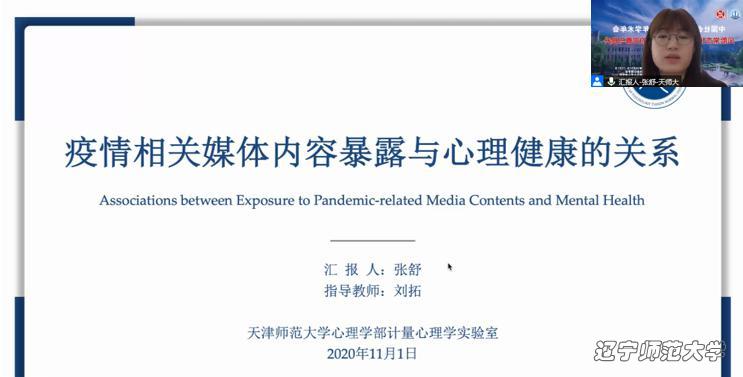 第二位报告人是天津师范大学心理学部学者张舒。她的研究目的是探究不同程度暴露于媒体内容的个体的心理健康水平的差异。研究采用改编前人研究的《媒体信息暴露问卷》,调查了被试过去一周内浏览各种媒体内容的频率。研究表明技术的进步使人们可以方便快捷地浏览大量的媒体报道,而资源保护理论表明疫情相关媒体信息暴露会对个体的心理健康产生消极影响。