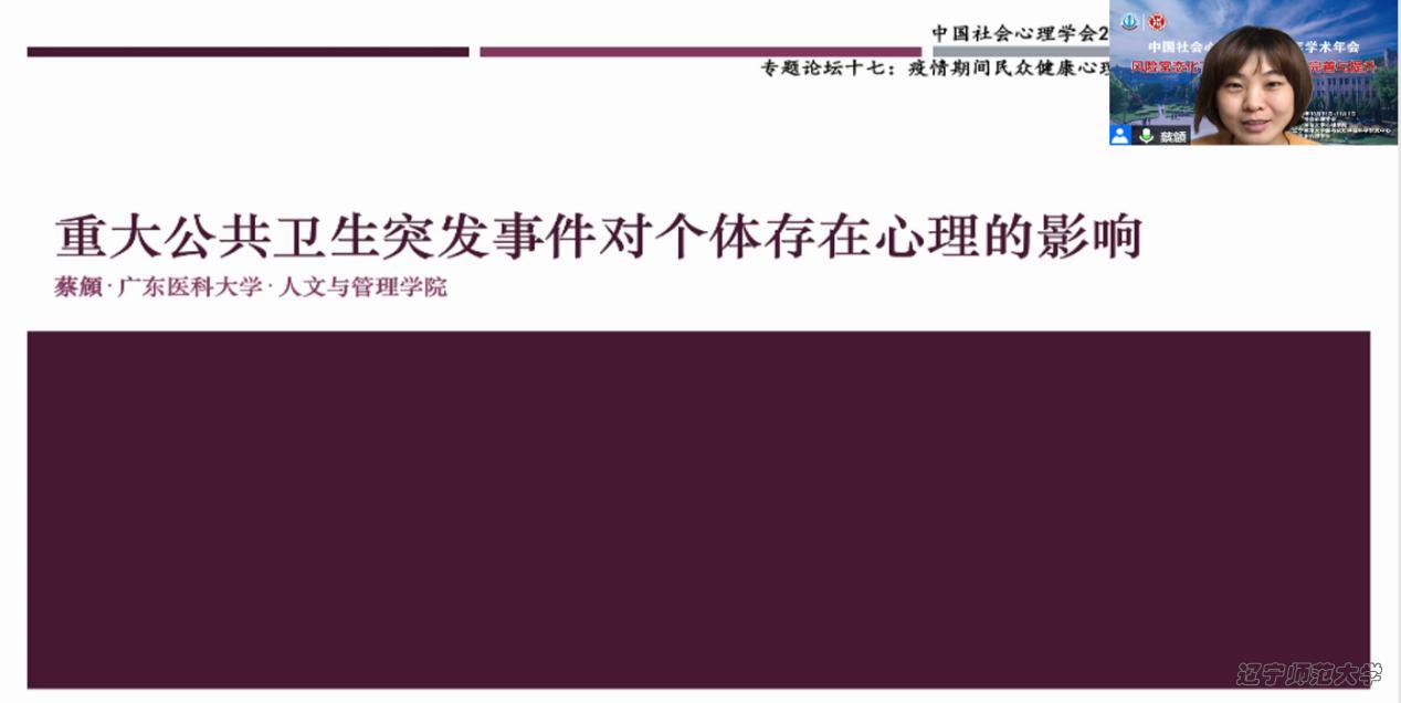 2020年11月1日10:10-12:10,中国社会心理学会2020年学术年会于线上举行。专题论坛十七的主题为“疫情期民众健康心理与行为的促进”。本次论坛的主持人是天津师范大学心理学部王锦老师,评议人是北京师范大学心理学部寇彧教授。