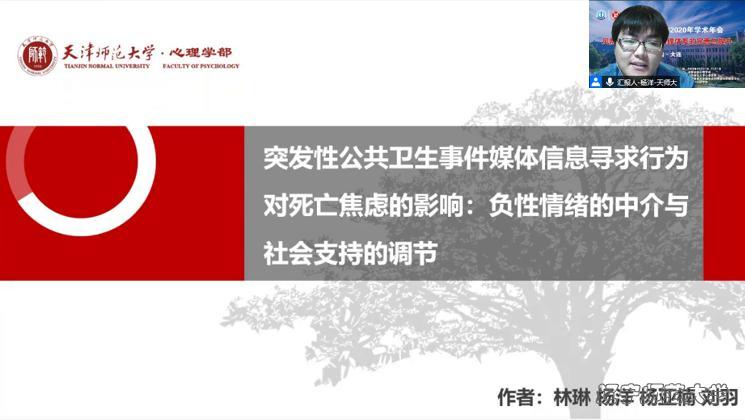 第三位报告人是天津师范大学心理学部学者杨洋。他汇报的研究项目旨在探究2020年初爆发的“新冠肺炎”疫情对个体死亡焦虑的影响及其影响过程。结果发现,媒体信息寻求行为正向预测死亡焦虑水平,负性情绪在媒体信息寻求行为和死亡焦虑水平关系中起到部分中介作用,而社会支持在其中起到一个保护性的作用,能够在低负性情绪状态时有效的缓解死亡焦虑水平。