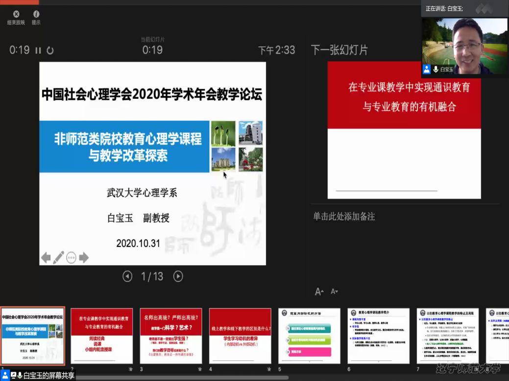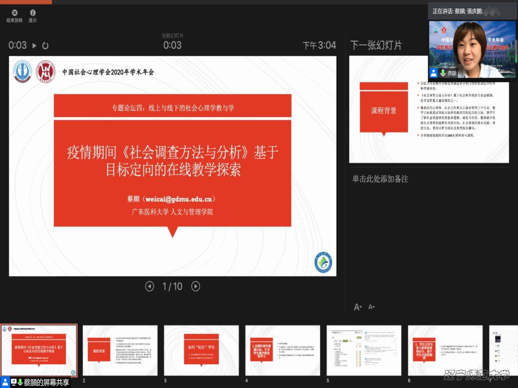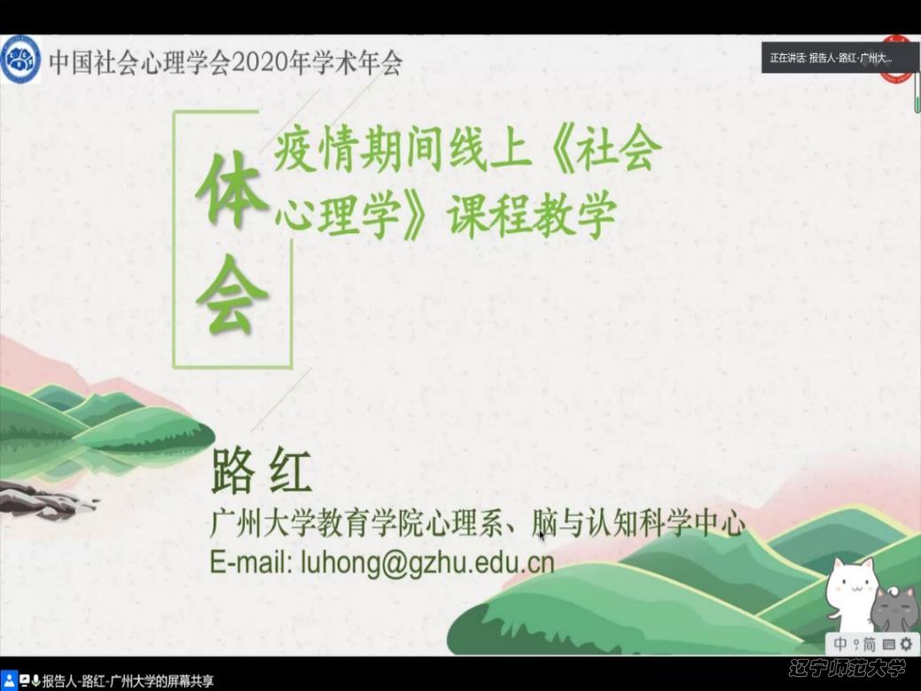 中国社会心理学会2020年学术年会第四场专题论坛于10月31日13:00-15:30在线举行,主题为“线上与线下的社会心理学教与学”。本次论坛的主持人是北京师范大学心理学院的寇彧教授和广州大学公共管理学院张庆鹏教师,助理教授,评议人是华东师范大学心理与认知科学学院应用心理学崔丽娟教授。