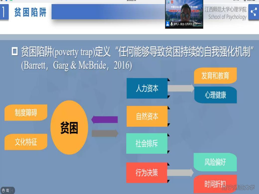江西师范大学学者黄龙做题为《行为贫困陷阱:概念、机制与干预对策》的研究报告。研究指出行为经济学家尝试从动机和认知两个视角探讨行为贫困陷阱的内在机制,并在全球范围内借助随机控制实验和助推等技术帮助贫困者摆脱行为贫困陷阱。