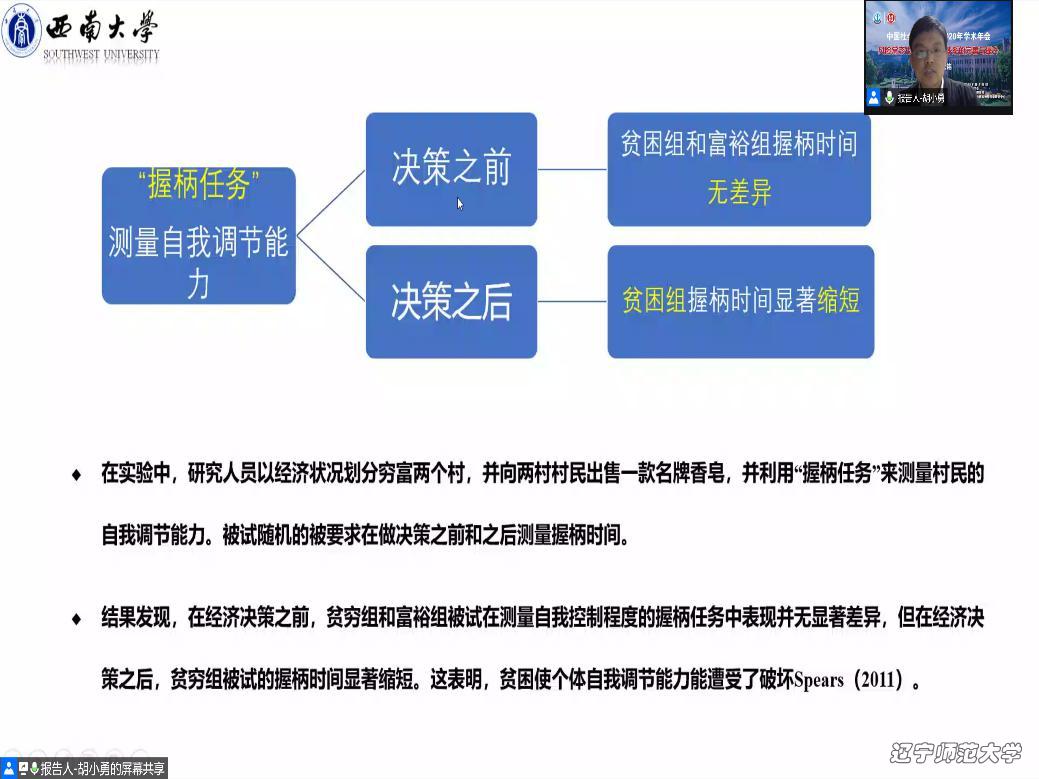 第三位报告人是来自西南大学心理学部的胡小勇教授。胡教授的报告《贫困影响自我调节的神经机制》基于生理神经科学的研究证据,表明贫困是通过改变个体执行注意神经网络、影响决策与情绪调节的神经回路和影响海马体结构和功能这三个方面来影响个体自我调节能力的。